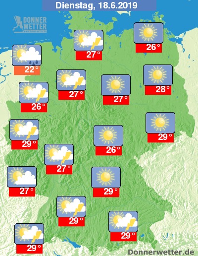 Der Tag startet für viele freundlich. Lediglich im Norden können sich regionale Wolkenfelder halten. Im Tagesverlauf entwickeln sich mit kräftiger Sonneneinstrahlung vor allem im Nordwesten mächtigere Haufenwolken mit der Neigung zu örtlichen Regengüssen und Gewittern. Auch an den Alpen können sich einzelne teils gewittrige Schauer bilden. Sonst bleibt es aber überwiegend heiter und sommerlich.