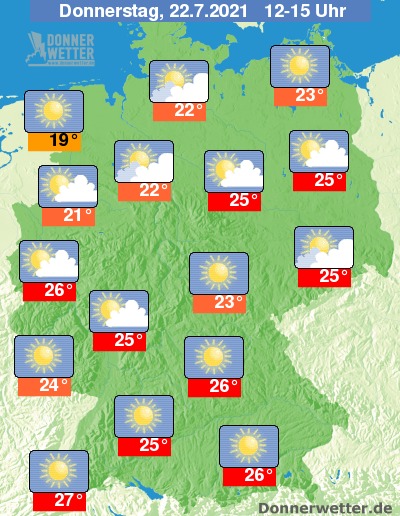 Heute Nachmittag ist es verbreitet heiter oder sonnig, vor allem im Osten und an der Nordsee ist es aber auch stark bewölkt. Hier sowie am Alpenrand sind ganz vereinzelt Schauer möglich, im übrigen Land bleibt es trocken. Die Temperatur steigt auf 19 Grad an der Nordsee und bis 27 Grad am Oberrhein.
