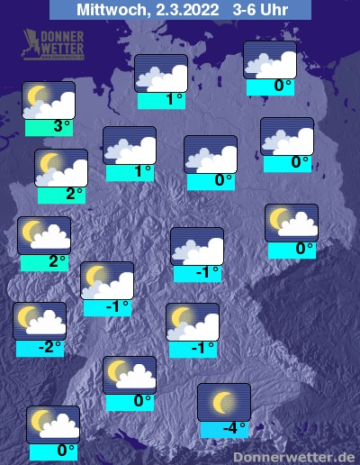 In der Nacht zum Mittwoch ist der Himmel über dem Süden und über Sachsen noch oft locker bewölkt und teils auch sternenklar, sonst ziehen jedoch oft viele und verbreitet auch dichte Wolken durch. Es bleibt landesweit trocken bei Tiefstwerten von 3 Grad in Cuxhaven und bis -4 Grad in Augsburg.