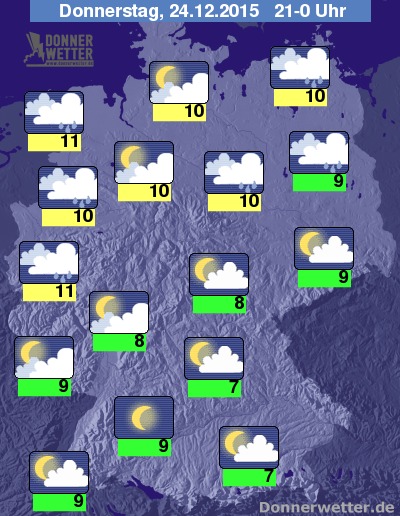 In der Nacht zum Freitag bleibt es im Süden bei einer meist lockeren Bewölkung und südlich der Donau bleibt es zudem auch bis zum Morgen weitgehend trocken. Im übrigen Bundesgebiet zieht zumeist dichte Bewölkung durch und vor allem über der breiten Mitte fällt auch gebietsweise Regen. Häufig auch locker oder aufgelockert bewölkt ist es indes sowohl im Osten des Landes als im weiteren Nachtverlauf auch im Nordwesten, hier bleibt es auch überwiegend trocken. Die Temperatur sinkt auf 9 Grad in Mannheim und bis 6 Grad in Mittelfranken. An den Küsten weht ein starker bis stürmischer Wind, besonders an der Nordsee sind weiterhin Sturmböen möglich.
