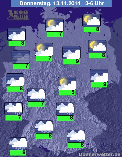 In der Nacht zum Donnerstag klingt der Regen im Nordwesten des Landes meist rasch ab, dazu bleibt es jedoch meist stark bis dicht bewölkt. In der Südhälfte von Deutschland hält sich eine weitgehend dichte Wolkendecke und es fällt zeitweise Regen, sonst ist es größtenteils stark, teils auch aufgelockert bewölkt und trocken. Im Westdeutschland kann sich gebietsweise Nebel oder Hochnebel entwickeln. Die Temperatur sinkt auf 9 Grad in Magdeburg und bis 5 Grad im Steigerwald.