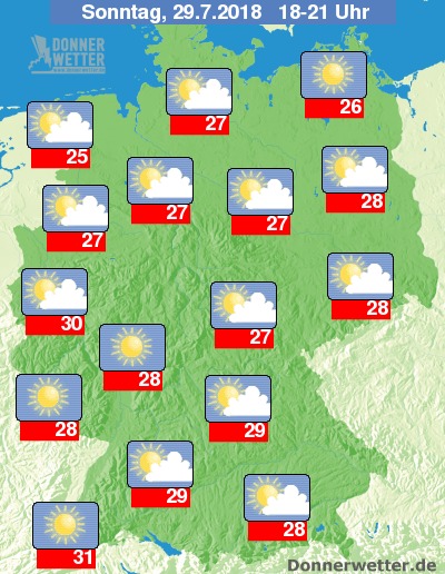 Heute Abend scheint verbreitet die Sonne und es ziehen nur lockere Wolkenfelder durch, häufig ist es auch wolkenlos. Bei Temperaturen zwischen 25 und 31 Grad bleibt es landesweit trocken.