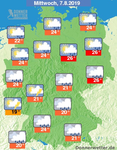 Die Wolken überwiegen und bringen vor allem den mittleren und südlichen Landesteilen verbreitet Regen, Schauer und örtliche Gewitter. Dabei kann es zu großen Niederschlagsmengen mit der Gefahr kleinräumiger Überschwemmungen kommen. Im Norden wechseln sich kurze sonnige Aufheiterungen mit Schauerwolken ab, auch hier kann es vereinzelt blitzen und donnern.