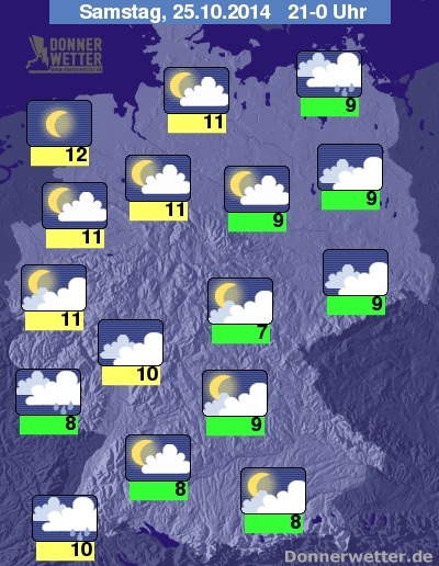 In der Nacht zum Sonntag bleibt es nach Osten hin, sowie im Südwesten oft stark bewölkt oder trüb, sonst ist es dagegen meist locker oder aufgelockert bewölkt. Es bleibt weitgehend trocken, jedoch bildet sich vor allem im Süden und Südwesten örtlich Nebel oder Hochnebel. Die Temperatur sinkt auf 10 Grad direkt an der Nordsee und auf etwa 5 Grad im Alpenvorland.