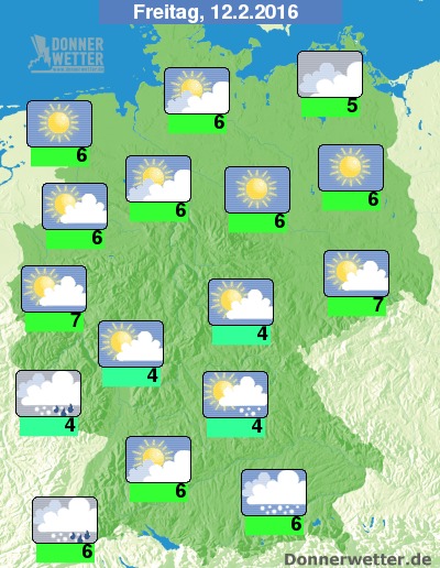 Am Freitag fällt im Südosten Deutschlands anfangs zeitweise Schnee, im Nordosten fällt bei oft dichten Wolken gebietsweise Regen oder Schnee. Im übrigen Bundesgebiet ist es zumeist aufgelockert, zum Teil auch locker bewölkt und es bleibt trocken. Gegen Abend werden die Wolken im Südwesten dichter und es kommt Regen, Schneeregen oder Schnee auf, dabei besteht Glättegefahr! Die Temperatur steigt auf 4 Grad im Grabfeld und bis 7 Grad im Rheinland.
