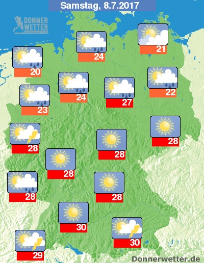 Am Samstag scheint insbesondere im Süden Deutschlands verbreitet die Sonne, hier bilden sich im Tagesverlauf bevorzugt im Alpenvorland, aber auch entlang des Rheins teils kräftige Schauer und Gewitter, sonst ist es meist trocken. Weiter nach Norden ist es teils heiter, teilweise ziehen aber auch dichte Wolken durch, dazu sind gebietsweise Schauer und auch Gewitter möglich. Die Temperatur steigt auf 20 bis 30 Grad.