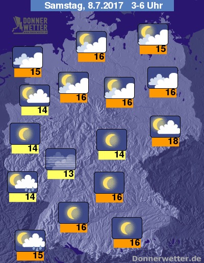 In der folgenden Nacht bilden sich im Osten, im Alpenvorland und im Südwesten noch einzelne Schauer und mögliche Gewitter, sonst ist es vor allem über der Südhälfte bereits verbreitet sternenklar und trocken. Weiter nach Norden hin ziehen mehr, jedoch meist aufgelockerte Wolken durch, dazu bleibt es ebenfalls trocken. Die Temperatur sinkt auf 18 Grad in Dresden und bis 13 Grad am Westerwald.