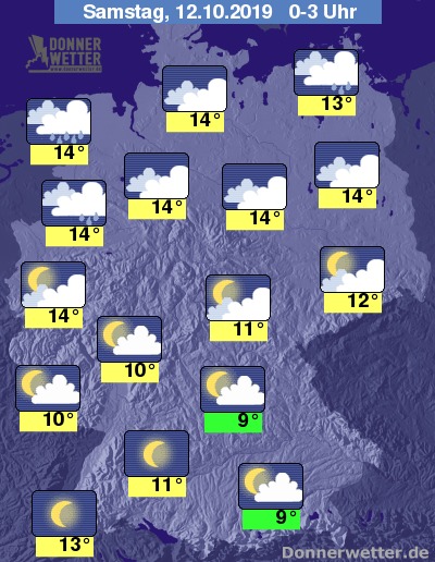 In der Nacht zeigt sich der Himmel über dem Norden des Landes verbreitet stark bewölkt oder bedeckt und vor allem an den Küsten und im Nordwesten muss zeitweise mit Schauern gerechnet werden. In der Mitte ist es anfangs noch locker oder aufgelockert bewölkt, später klart der Himmel im Süden weitgehend auf.