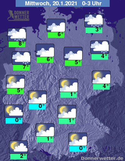 Bei längerem Aufklaren gehen die Temperaturen im Süden stellenweise in den leichten Frostbereich zurück und es droht dann die Gefahr von Glätte durch überfrierende Nässe. Sonst bleibt es bei Werten von meist 7 bis 2 Grad frostfrei.