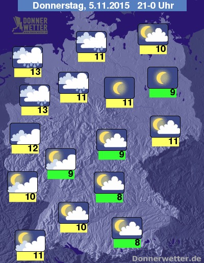 Im Rest der Republik bleibt es bei zunächst überwiegend lockerer Bewölkung trocken. In den frühen Morgenstunden des Freitag nimmt die Bewölkung dann aber vielerorts zu, die Temperaturen liegen dann bei Werten um 13 Grad C im Emden und um 6 Grad C am Alpenrand.