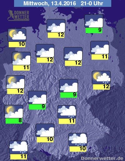 Heute Abend bleibt es über dem Land bei größtenteils dichter Bewölkung, Auflockerungen sind am ehesten in einem breiten Streifen vom Rheinland bis hin zur Nordsee möglich, hier bleibt es auch weitgehend trocken, sonst fällt gebietsweise Regen oder es bilden sich einzelne Schauer. Die Abendtemperatur liegt bei 12 Grad in Dresden und 8 Grad im Saargau.