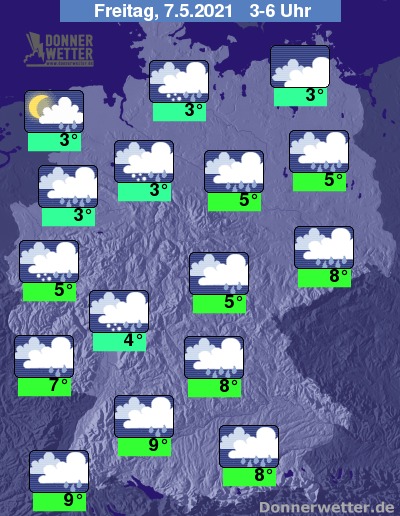 In der bevorstehenden Nacht ziehen verbreitet dichte Wolken durch und es fällt immer wieder Regen, zum Teil ist sogar Schneeregen oder Schnee bis in die Niederungen möglich. Die Temperatur sinkt auf 9 Grad in Stuttgart und bis 3 Grad im Norddeutschen Tiefland.