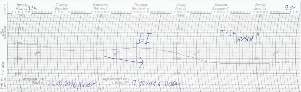 Unser Schrieb zeigt den Luftdruckverlauf zwischen dem 31.10. und 07.11.2016 an unserer Wetterstation in Bonn. Gut zu erkennen gibt sich der vor allem am vergangenen Freitag stark abgefallene Luftdruck.