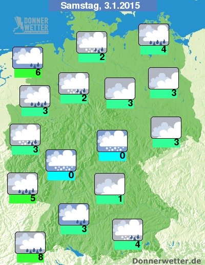 Heute erwartet uns ein verbreitet trüber, nasser und häufig auch windiger Tag. Dabei ist es zumindest in der Osthälfte am Vormittag noch weitgehend trocken, jedoch schon meist bedeckt. Sonst ziehen vormittags von Westen her bereits dichte Wolken mit Regen, Schneeregen und Schnee auf, dabei kann es vielerorts glatt auf den Straßen werden. Genauere Informationen zur Wettergefahrenlage erhalten Sie auf www.unwetter.de! Am Nachmittag ziehen die dichten Regen-, Schneeregen und Schneewolken auch in die Osthälfte des Landes und sorgen hier besonders im Osten für vielfach rutschige Straßen durch zum Teil kräftigen Nassschnee. Im Süden fällt der Niederschlag zumeist als Regen, jedoch kann es regional auch hierbei, durch mögliches Blitzeis zum Teil spiegelglatt werden. Vor allem im Norden und Osten weht dazu noch ein teils starker Wind. Die Temperaturen steigen auf 0 Grad im Coburger Land und bis auf 8 Grad im Breisgau.