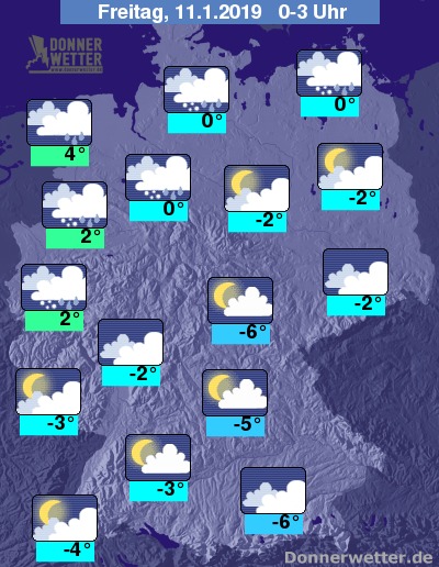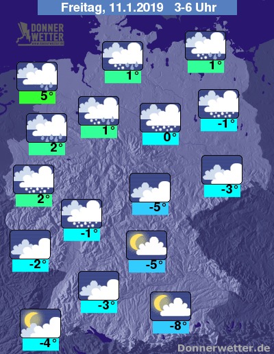 Die Temperaturen erreichen Werte um -8 Grad C am Alpenrand und um 5 Grad C in Emden.