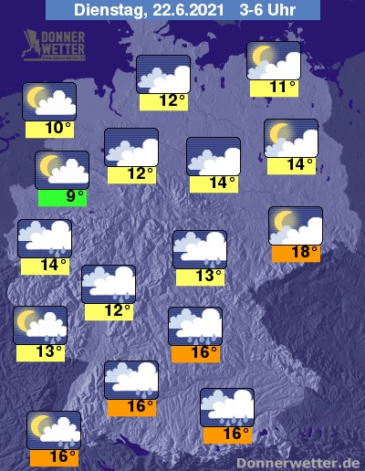 In der kommenden Nacht halten sich über der Südhälfte meist dichte Wolken und es können sich hier wiederholt Schauer und vereinzelt auch Gewitter bilden. Über der Nordhälfte ist es teils stark, teils aufgelockert bewölkt, dazu bleibt es trocken. Die Temperatur sinkt auf 18 Grad in Dresden und bis 9 Grad in Münster.