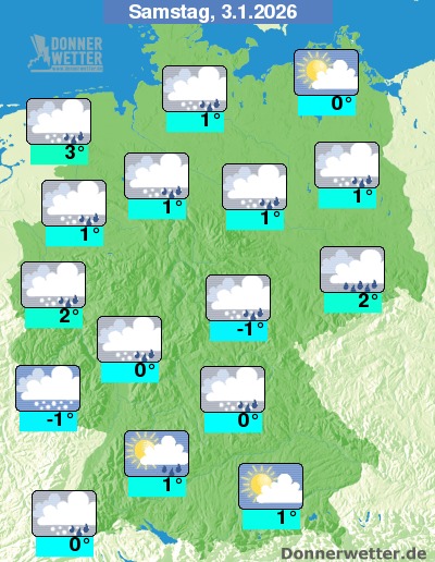 Heute zeigt sich der Süden oft heiter und trocken. Im übrigen Bundesgebiet zieht hingegen oft starke, zum Teil auch noch aufgelockerte Bewölkung durch, dabei bilden sich gebietsweise Schneeschauer, zum Teil mischt sich auch Regen oder Schneeregen in die Niederschläge. Die Höchstwerte liegen bei -1 Grad im Eichsfeld und bis 3 Grad an der Elbmündung. An der See weht ein oft stürmischer Wind.