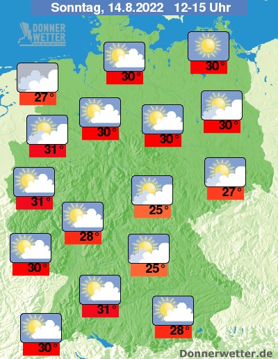 Heute Nachmittag ist es überwiegend heiter oder sonnig, jedoch bilden sich hier und da auch ein paar Quellwolken, dabei bleibt es weitgehend trocken. Die Temperatur liegt bei 25 Grad im Grabfeld und bis 31 Grad am Niederrhein.
