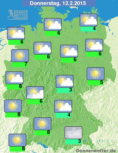 Am Donnerstag wird es in weiten Landesteilen der Bundesrepublik heiter oder sonnig und es bleibt dazu trocken. Im Süden und Südosten des Landes hält sich gebietsweise jedoch noch hochnebelartige Bewölkung, auch im äußeren Norden ist es oft noch trüb, allerdings ebenfalls trocken. Die Temperatur steigt auf 3 Grad im Südosten und bis etwa 8 Grad in der Kölner Bucht.
