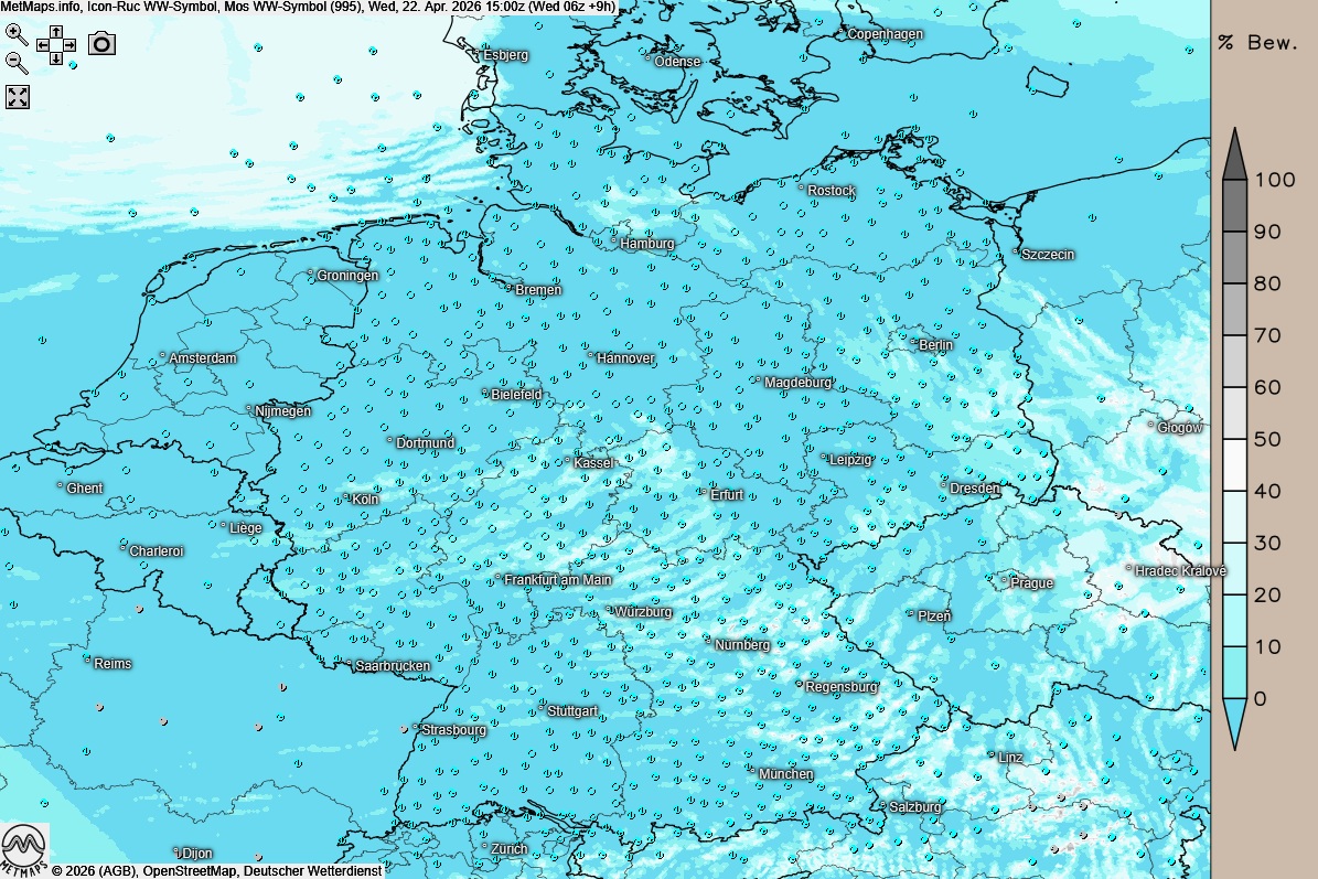 Diese Blockadelage sorgt verbreitet für einen wolkenlosen bis gering bewölkten Himmel und unterbindet jegliche Niederschlagsneigung.