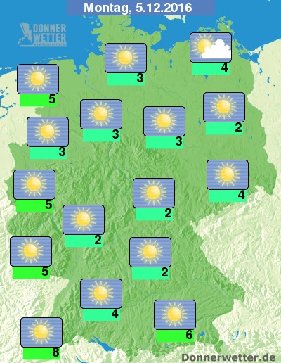 Heute strahlt die Sonne über Deutschland von einem überwiegend wolkenlosen Himmel. Hier und da können aber auch lockere Wolken vorüberziehen, am meisten im Umfeld der Ostsee. Es bleibt landesweit trocken. Die Temperatur steigt auf Werte zwischen 2 und 5, im Süden bis 8 Grad.