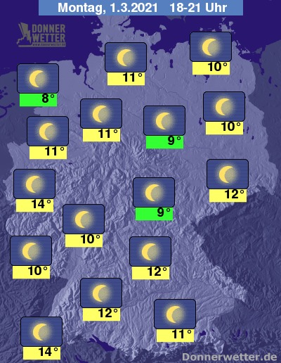 Heute Abend ist es überall sternenklar, dazu bleibt es trocken. Die Temperatur liegt bei etwa 8 Grad in Cuxhaven und bis 14 Grad in Köln.