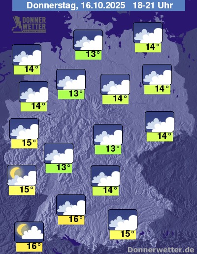 Heute Abend bleibt der Himmel verbreitet stark oder dicht bewölkt und Auflockerungen sind eher selten, vor allem entlang des Ober- und Mittelrheins und allgemein im Südwesten lockert es öfters auf. Es bleibt weitgehend trocken bei Werten von 13 Grad in der Norddeutschen Tiefebene und etwa 16 Grad im Breisgau.