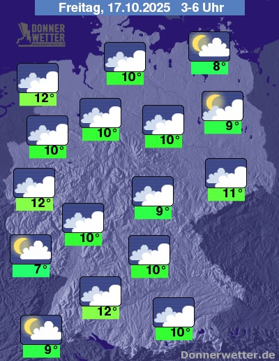 In der Nacht zum Freitag ist der Himmel weiterhin wolkenverhangen und Auflockerungen sind nur vereinzelt möglich. Häufig ist es auch neblig-trüb, Regen fällt aber kaum. Vor allem nach Südwesten hin zeigt sich der Himmel auch teils locker bewölkt. Die Temperatur sinkt auf 12 Grad in Cuxhaven und bis 7 Grad in Saarbrücken.