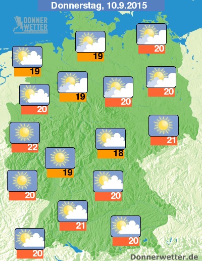 Am Donnerstag scheint besonders im Westen die Sonne von einem häufig wolkenfreiem Himmel, aber auch sonst ist es über Deutschland verbreitet heiter bis wechselnd bewölkt. Im Norden ziehen hier und da auch mal dichtere Wolken durch, dabei bleibt es aber ebenso trocken. Die Temperatur steigt auf 18 Grad im Grabfeld und bis 22 Grad in Köln.