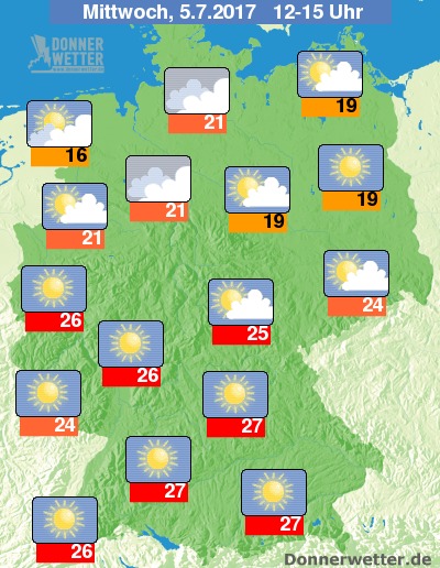 Heute Nachmittag bleibt es über der Südhälfte des Landes verbreitet sonnig und dazu trocken. Weiter nach Norden ist es gebietsweise ebenfalls sonnig, hier und da ziehen jedoch auch mal dichte Wolken durch, dazu besteht ein leichtes Schauerrisiko. Die Temperatur liegt bei kühlen 16 Grad an der Nordsee und etwa 27 Grad in Nürnberg.