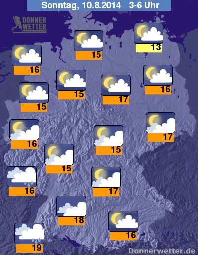 In der Nacht bilden sich im Breisgau gebietsweise noch weitere Schauer, sonst ist es bei meist geringer bis aufgelockerter Bewölkung aber verbreitet trocken. Die Temperatur sinkt auf 19 Grad im Oberrheingraben und etwa 13 Grad an der Müritz.