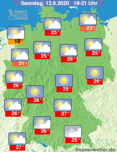 Heute Abend ziehen vor allem im Norden auch oft mehr und im Nordseeumfeld teils dichte Wolken auf, dabei ist hier etwas Regen möglich. Auch im Süden und Südosten ziehen zum Teil einige und teils dichte Wolken durch, hier bleibt es aber trocken. Im übrigen Land ist es weiterhin heiter bis sonnig und ebenfalls trocken. Die Temperatur liegt bei 18 Grad in Cuxhaven und bis 29 Grad in Stuttgart.