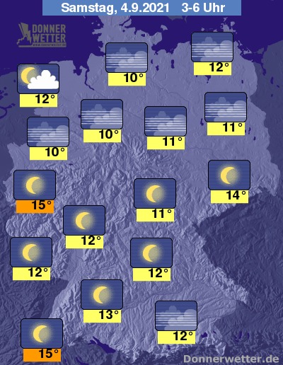 Die Temperaturen gehen in den Frühstunden auf Werte um 15 Grad am Hochrhein und um 10 Grad entlang der Weser zurück.