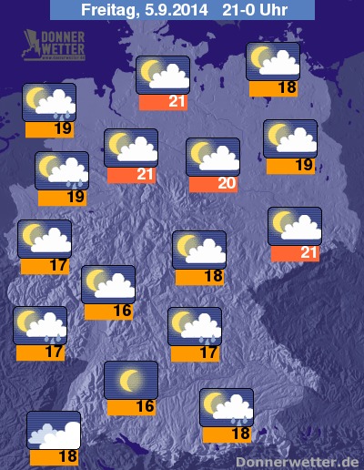In der Nacht zum Samstag bleibt es häufig bei dem Sterne-Wolken-Mix, vor allem im Osten und Nordosten ist es häufig sternenklar. Nur vereinzelt sind noch Schauer und Gewitter möglich. Der Schwerpunkt liegt hierbei auf dem Nordseeumfeld, sonst bleibt es weitgehend trocken. Die Temperatur sinkt auf 17 Grad in Chemnitz und 12 Grad am Pfälzer Wald.