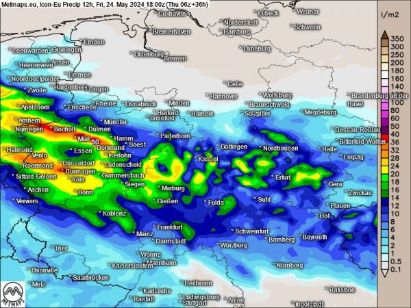 Die Karte zeigt die 12-Stunden-Niederschlagssummen nach ICON bis 18:00 Uhr.