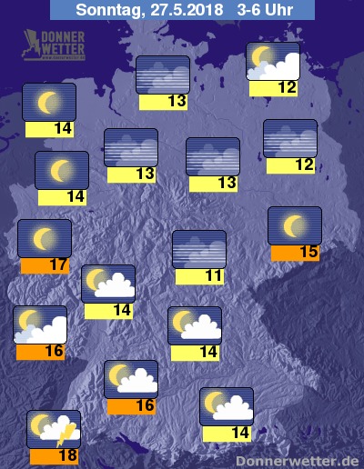 In der folgenden Nacht ziehen im Süden meist lockere, teils auch mal mehr Wolken durch, dabei sind im äußersten Süden lokal auch Schauer oder Gewitter möglich. Im übrigen Bundesgebiet zeigt sich der Himmel meist sternenklar, dazu bleibt es trocken. Die Temperatur sinkt auf 18 Grad in Freiburg und bis 11 Grad im Thüringer Becken.