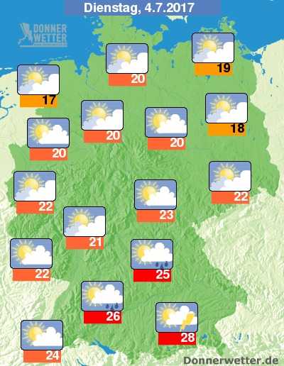 In der Mitte halten sich zunächst dichtere Wolken, aus denen örtlich etwas Regen fällt, oder einzelne Schauer auftreten. Im Tagesverlauf wird es hier, wie bereits zuvor schon in den übrigen Landesteilen sonniger. Die Höchsttemperaturen erreichen angenehm warme 22 bis 28 Grad. Im Alpenvorland können sich am späten Nachmittag lokale Schauer und Gewitter entwickeln.