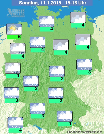 Am Sonntag bleibt es am Himmel weitgehend stark oder dicht bewölkt, größere Auflockerungen sind am ehesten an der Nordsee möglich. Es fällt zeitweise, zum Teil kräftiger Schnee oder Schneeregen, nach Westen und Norden hin auch Regen. Die Temperatur steigt auf nasskalte Werte zwischen 1 Grad in München und 6 Grad in Emden. Der Wind weht frisch bis stark, in Böen auch stürmisch. An den Küsten und auf den Bergen herrscht teils Sturm, dabei können teils schwere Sturmböen auftreten.