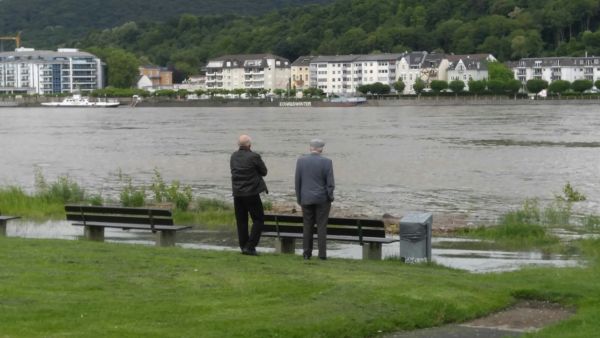 Unsere Bilder zeigen den hohen Rheinpegel gestern bei Rheinkilometer 645 mit Blick auf Königswinter. Die Pegel vieler Flüsse, vor allem im Süden und Westen Deutschlands, werden zumindest auch in den nächsten 48 Stunden weiter steigen.