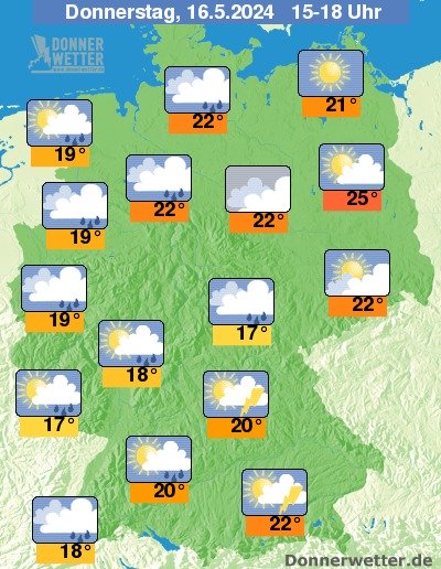 In den Nachmittagsstunden zeigt sich der Himmel über dem äußersten Osten und Nordosten heiter oder es ist sonnig, dabei bleibt es trocken. In den übrigen Landesteilen überwiegt wechselnde oder starke Bewölkung, dabei muss immer wieder mit Schauern und teils kräftigen Gewittern, lokal auch mit Starkregen, Hagel und stürmischen Böen einhergehend, gerechnet werden.