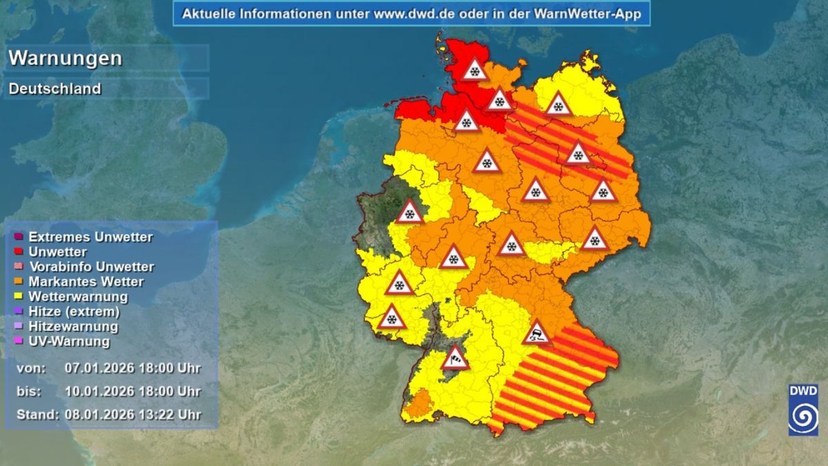In den nächsten Stunden zeigt sich der Himmel meist stark bewölkt oder bedeckt, dabei zieht am Donnerstagnachmittag und -abend von Westen und Südwesten Niederschlag auf. Zunächst fällt dieser meist als Schnee, im weiteren Verlauf geht dieser auch in gefrierenden Regen über. Vorsicht, Glättegefahr!