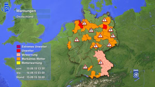 Abends Gewitter, besonders in Niedersachsen, Bayern und in Berlin/Brandenburg und MV. Hier die aktuelle Warnkarte: Im 2- Stunden Wetter werden Sie für Ihre Region gewarnt:
