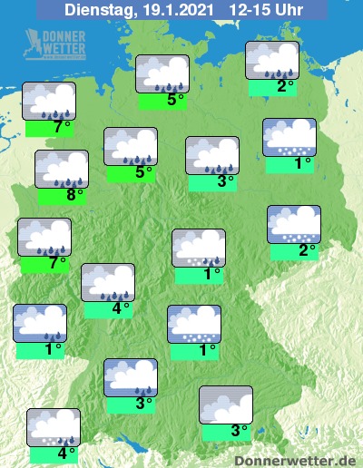 Am frühen Nachmittag zieht eine Warmfront mit Niederschlägen über die Landesmitte und den Norden hinweg. Nach Osten hin fällt noch häufig Schnee oder Schneeregen mit Glättegefahr, später allgemein Regen oder Sprühregen. Südlich der Donau bleibt es weitgehend trocken.