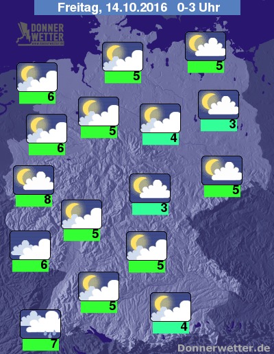 In der Nacht bleibt es fast überall trocken, lediglich im äußersten Südwesten regnet es mitunter noch. Sonst ist der Himmel meist bedeckt, hier und da funkeln aber auch die Sterne. Die Tiefstwerte liegen zwischen 3 Grad in den östlichen Mittelgebirgen und 7 Grad im Schwarzwald.
