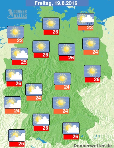 Am Freitag ist es über der Bundesrepublik verbreitet heiter, vor allem über der Nordosthälfte auch überwiegend sonnig und es bleibt zunächst weitgehend trocken. Im Laufe des Nachmittags können sich im Westen und Süden aber auch zunehmend Quellwolken bilden, dazu sind jedoch nur selten Schauer oder Gewitter möglich, sonst bleibt es trocken. Die Temperatur steigt auf 22 Grad in Ostfriesland und bis etwa 26 Grad im Ruhrgebiet.