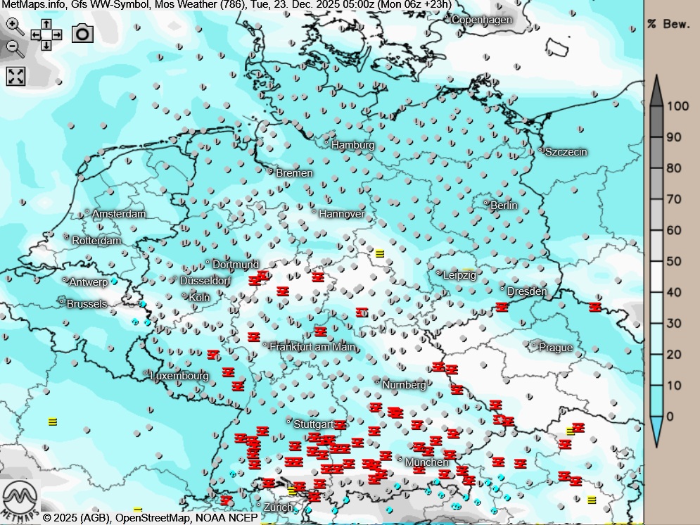Am Dienstag scheint über den südlichen Mittelgebirgen zunächst noch häufig die Sonne, sonst zeigt sich der Himmel heute meist bedeckt oder es ist neblig-trüb. Größere Auflockerungen beschränken sich am Dienstag vor allem auf den Norden. Es bleibt trocken.