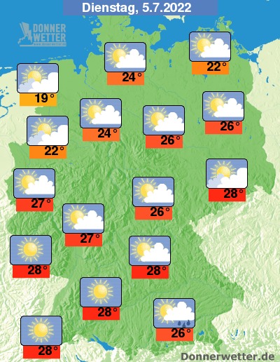 Am Dienstag ist es überwiegend heiter oder sonnig, hier und da ziehen einige Wolkenfelder durch. Im Küstenumfeld und an den Alpen sind zudem lokale Schauer möglich, während es sonst trocken bleibt. Die Temperatur steigt auf 19 Grad an der Nordsee und bis 28 Grad in der Lausitz.