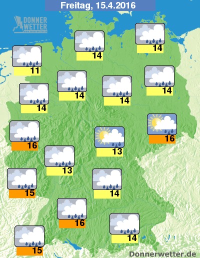 Am Freitag ziehen überwiegend dichte Wolken durch, gebietsweise, wenngleich seltener zeigen sich auch Aufheiterungen. Zunächst fällt zeitweise Regen, am Nachmittag sind es dann oft auch einzelne Schauer. Im Süden und Westen der Republik sind lokale Gewitter möglich. Die Temperatur steigt auf 11 Grad in Ostfriesland und bis 16 Grad im Oberrheingraben.
