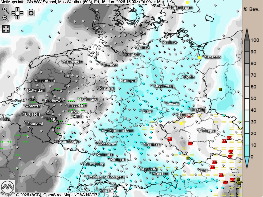 Am Freitagnachmittag kann sich über dem äußersten Osten und Südosten weiterhin hartnäckiger Nebel oder Hochnebel halten; im Westen und Nordwesten dominiert am Nachmittag dichte Bewölkung, zeit- und gebietsweise kann es hier auch etwas tröpfeln. Sonst zeigt sich der Himmel am Nachmittag verbreitet heiter bis wolkig und es bleibt überwiegend trocken.