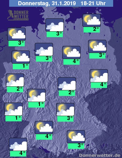 Am Abend bleibt der Himmel über weiten Landesteilen bedeckt oder aufgelockert bewölkt, vor allem in der Nordhälfte ist es teils auch locker bewölkt. Es bleibt zunächst überwiegend trocken, um 1 bis 4 Grad.